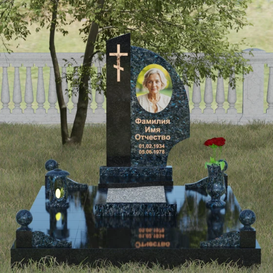 Правая часть композиции выполнена в форме изящного «крыла» или плавной волны, чьи округлые грани смягчают монументальность камня. Такая форма традиционно ассоциируется с нежностью, душевным теплом и вечной памятью о близком человеке. Особое внимание уделено фактуре: идеально гладкая, зеркальная полировка лицевых поверхностей создает глубокие отражения, в которых играет свет, визуально «оживляя» тяжелый гранит. Кромки и фаски обработаны с ювелирной точностью, подчеркивая премиальный статус изделия. Благоустройство участка продумано до мелочей: стела установлена на массивный гранитный постамент, который фланкируют декоративные каменные шары, придающие захоронению архитектурную завершенность. В едином ансамбле с памятником предусмотрена изящная ваза, предназначенная для живых цветов, что подчеркивает непрерывную связь между миром живых и миром ушедших.