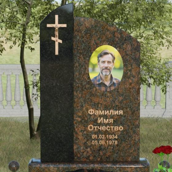 Данное ритуальное изделие представляет собой выразительную художественную композицию, построенную на гармонии двух различных фактур и форм. Выбор этой модели обусловлен её глубоким символизмом: асимметричное разделение стелы на две части олицетворяет земной и небесный пути. Левая часть, выполненная в виде строгого вертикального столпа из насыщенного цветного гранита, служит основанием для объемного православного креста с детально проработанным распятием. Правая же часть, имеющая мягкий, плавный изгиб верхней грани в форме волны, создает идеальное пространство для размещения портрета и памятных слов. Сочетание строгой геометрии и лиричного изгиба позволяет выразить всю многогранность чувств — от глубокой скорби до светлой памяти.