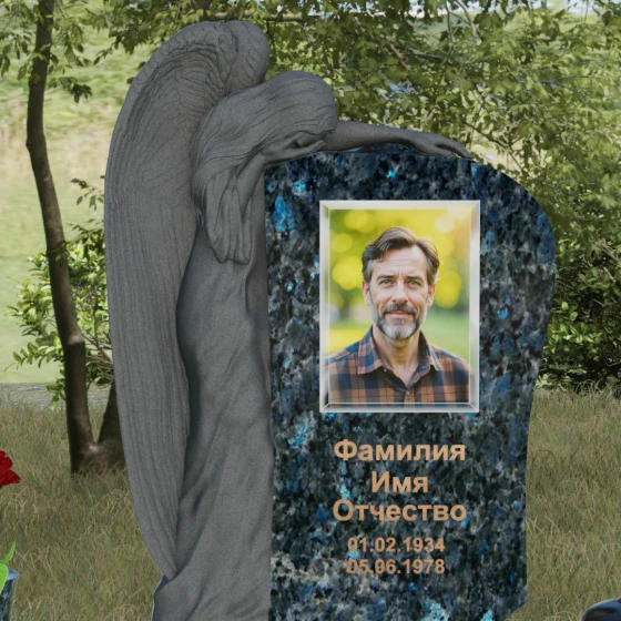 Центральным художественным элементом композиции является искусная скульптура скорбящего ангела, выполненная в технике глубокого барельефа. Фигура небесного защитника органично интегрирована в левую часть каменного полотна. Мы видим детальную проработку каждого перышка на опущенных крыльях, мягкие, ниспадающие складки плащаницы и кроткий изгиб шеи — ангел склонил голову в знак вечного сострадания. Особого внимания заслуживает игра фактур: матовая, бархатистая поверхность резной фигуры контрастирует с безупречным зеркальным блеском основной плоскости, на которой располагается портрет и эпитафия. Такая полировка создает эффект глубокого черного или цветного зеркала, в котором отражается небо, символизируя связь между земным и небесным.
