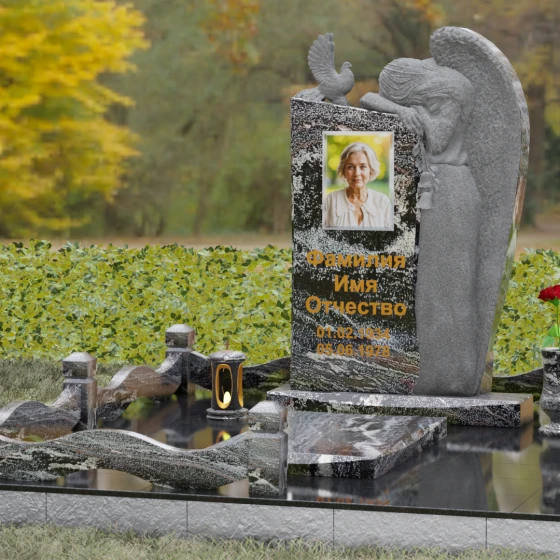 Верхний контур монумента украшен реалистичной фигуркой голубя, символизирующего чистоту души и мир. Композиция выстроена на игре фактур: идеально гладкий, иссиня-черный гранит отражает окружающий мир, в то время как резные элементы имеют благородную шероховатость, подчеркивающую природную суть материала. Форма стелы асимметрична, что придает всему комплексу динамику и современный вид в стиле модерн, сохраняя при этом торжественную монументальность.