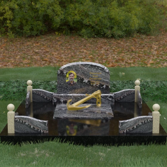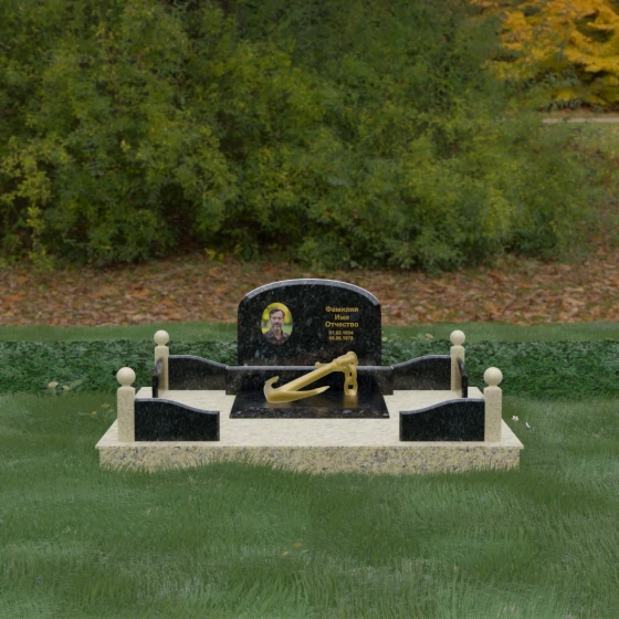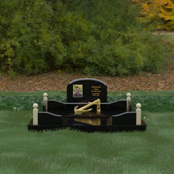 • Центральный символ: На надгробной плите расположен объемный декоративный элемент в виде золотого якоря с массивной цепью. Этот символ олицетворяет надежду, твердость характера и профессиональный путь, связанный со стихией, становясь смысловым центром всего мемориала.