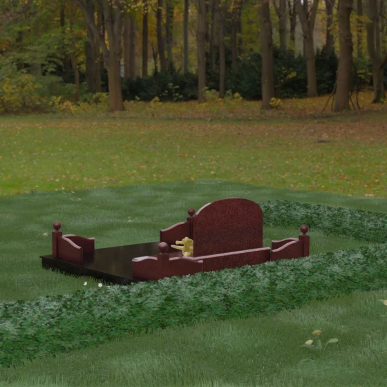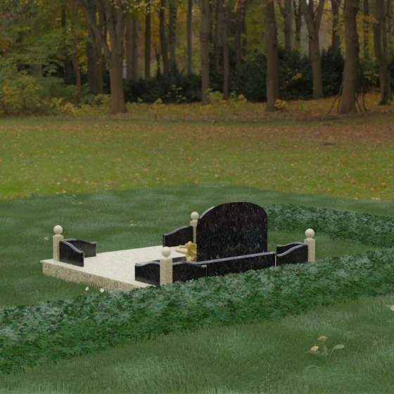 Представленная мемориальная композиция — это не просто дань уважения, а монументальное художественное произведение, воплощающее в камне идею незыблемости, надежности и вечного пристанища. В центре ансамбля расположена величественная вертикальная стела с мягким арочным завершением, чьи формы напоминают небесный свод. Геометрия изделия продумана до мелочей: строгие линии основания гармонично сочетаются с плавными изгибами боковых ограждений, создавая визуальный баланс между земной тяжестью камня и духовной легкостью формы. Особый акцент сделан на игре фактур — зеркальная, глубокая полировка лицевых поверхностей контрастирует с благородной матовостью резных элементов, подчеркивая природную красоту и глубину натуральной породы.