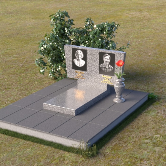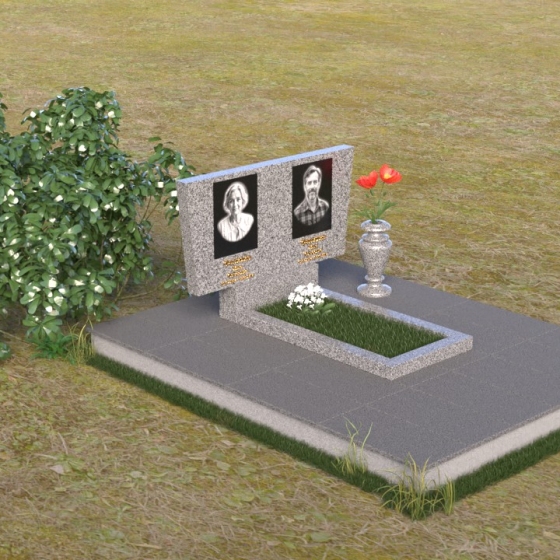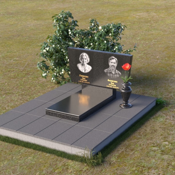 Этот памятник представляет собой изысканную композицию, где строгость линий сочетается с плавными, утонченными деталями. Стела имеет прямоугольную форму с асимметричной верхней гранью. С левой стороны верхний угол плавно скошен вниз, создавая ощущение ниспадающей драпировки или крыла ангела, оберегающего покой усопших. Правый верхний угол стелы остается прямым, что придает конструкции визуальную устойчивость и завершенность. Боковые грани стелы тщательно отполированы, что создает эффект зеркального блеска, отражающего окружающий мир и символизирующего связь между земным и небесным. Под стелой располагается горизонтальная плита меньшего размера, также выполненная в зеркальной полировке, создавая эффект единого целого и усиливая визуальную глубину композиции. Все элементы памятника установлены на широкое основание, облицованное плиткой серого цвета, что обеспечивает устойчивость и долговечность конструкции.