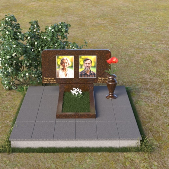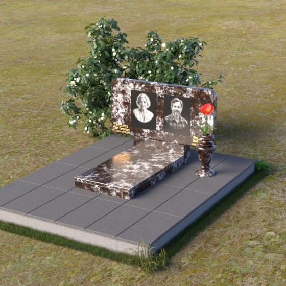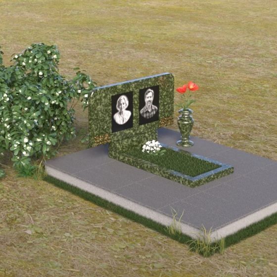 Этот ритуальное изделие – воплощение сдержанной элегантности и глубокого уважения. Прямоугольная стела с мягко скругленными углами создает ощущение завершенности и покоя. Верхняя часть памятника, словно рамка для воспоминаний, украшена выгравированными портретами. Полированная поверхность камня, подобно зеркалу, отражает свет, создавая игру бликов и теней, что придает глубину и объем изображениям. Горизонтальная плита под портретами добавляет композиции устойчивости и визуально расширяет пространство. Все элементы памятника объединены лаконичным дизайном, который говорит о достоинстве и вечной памяти.