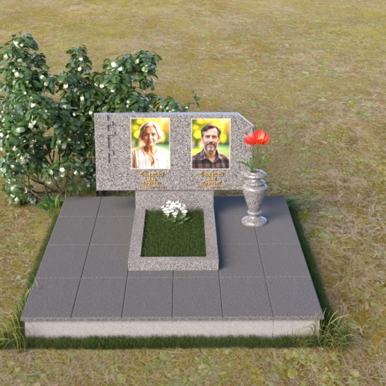 В верхней части памятника располагается вертикальная стела прямоугольной формы с небольшими скошенными углами, придающими ей более мягкий и благородный вид. На поверхности стелы размещены два портрета усопших, выполненные с высокой детализацией. В левом верхнем углу вырезано изображение православного креста, выполненного в лаконичном стиле, подчеркивающем сдержанность и глубину веры. Справа от портретов вырезана изящная роза с детально проработанными лепестками, символизирующая любовь и вечную память. Нижняя часть стелы плавно переходит в горизонтальную плиту, на которой размещается табличка с именами и датами жизни усопших. Горизонтальная плита, в свою очередь, опирается на строгий постамент, обеспечивающий устойчивость всей конструкции.