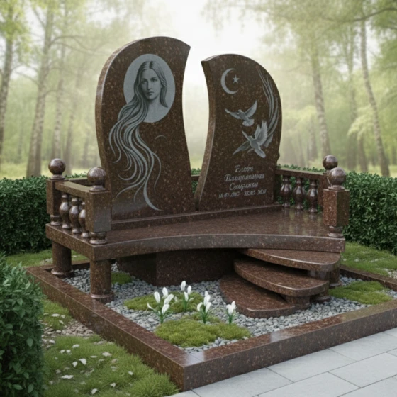 Мемориальная композиция ПН 063 представляет собой уникальное художественное произведение, где каждая линия и форма наполнены глубоким символизмом. Центральный элемент – две асимметричные стелы, словно раскрытые створки книги или два крыла, стремящиеся ввысь. Их плавные, волнообразные грани отполированы до зеркального блеска, создавая игру света и тени, подчеркивающую глубину черного гранита. Левая стела, более массивная и высокая, украшена гравировкой женского лика, выполненного с невероятной детализацией. Длинные, струящиеся волосы, обрамляющие лицо, создают ощущение легкости и воздушности, контрастируя с монументальностью камня. Правая стела, чуть ниже и изящнее, несет на себе изображения двух голубей, парящих на фоне полумесяца со звездой – символы чистоты, мира и духовного вознесения. Эти элементы выполнены с тончайшей проработкой деталей, где каждая перышко и изгиб крыла кажутся живыми, а матовая фактура гравировки эффектно выделяется на фоне глянцевой поверхности.