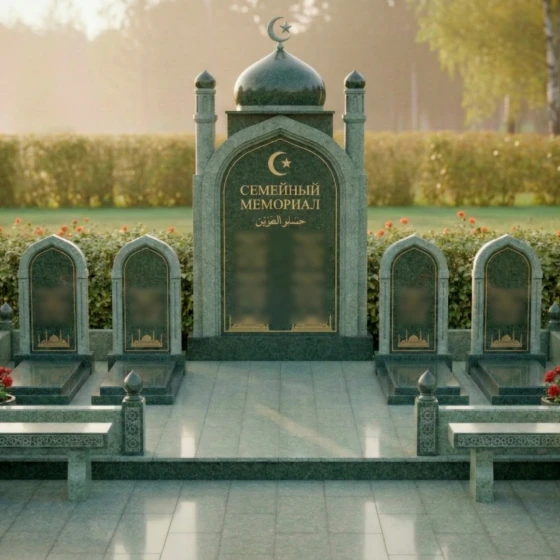 Оформление: Для центральной арки я рекомендую использовать сусальное золото при нанесении фамилии рода и каллиграфии — это подчеркнет статусность объекта. Для индивидуальных стел идеально подойдет лазерная гравировка портретов высокой четкости: на темном полированном камне лица будут выглядеть живыми, сохраняя теплоту взгляда на десятилетия. Если вы предпочитаете аскетичность, можно ограничиться только золоченым арабским орнаментом и текстами из священных книг.
