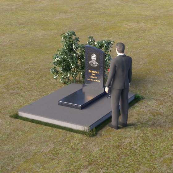 Взгляд невольно приковывает стела, выполненная в форме элегантной арки. Ее верхняя часть, скругленная мягким полумесяцем, словно устремляется ввысь, символизируя духовность и надежду. Лицевая поверхность стелы отполирована до зеркального блеска, отражая свет и создавая ощущение глубины. На ней искусно выгравирован портрет, выполненный с высокой детализацией, позволяя сохранить образ дорогого человека. Ниже располагается надпись, выполненная золотыми буквами, которые ярко выделяются на фоне черного гранита, словно светлые воспоминания, пробивающиеся сквозь время.