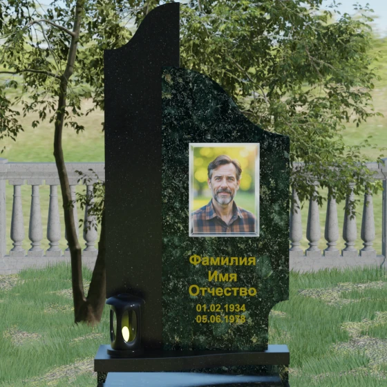 Данная мемориальная композиция представляет собой сложный архитектурный ансамбль, в основе которого лежит игра геометрических форм и контрастных фактур. Основная стела состоит из двух вертикальных элементов разной высоты и конфигурации, что создает динамичный и в то же время уравновешенный силуэт. Левая часть стелы выполнена с мягким, волнообразным изгибом, напоминающим спокойное течение времени или уходящий за горизонт путь. Правая часть — более высокая, узкая и статная, с асимметричным «рваным» навершием, которое символизирует возвышенность духа и незыблемость памяти. Такое сочетание плавности и резкости делает это надгробие из натурального камня универсальным решением, способным передать как нежность утраты, так и твердость характера ушедшего человека.