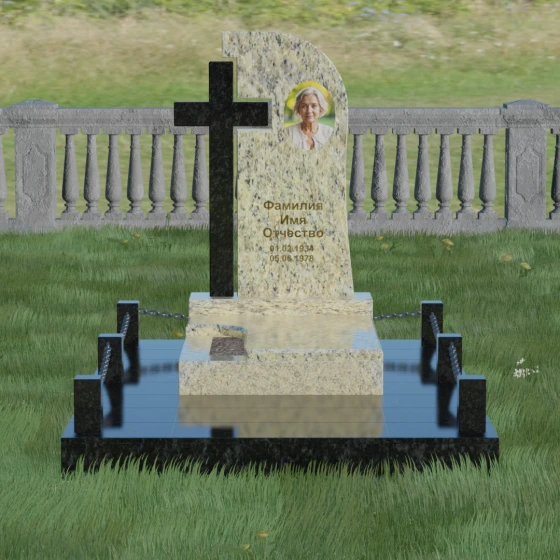 Правая часть стелы — это широкое каменное полотно с мягким, плавным изгибом в верхней части, напоминающим небесный свод или церковный купол. Контраст между прямолинейностью креста и текучестью основной плиты создает уникальный художественный ритм. Боковые грани и верхушка изделия отполированы до зеркального блеска, в котором отражается небо, в то время как глубокая гравировка текста и портрета в овальной нише подчеркивают индивидуальность монумента. Особую массивность конструкции придает основание — монумент возведен на высокий гранитный цоколь. По периметру установлены монументальные столбики с декоративными фасками, соединенные массивными цепями, что создает защищенный контур и атмосферу уединенного покоя.