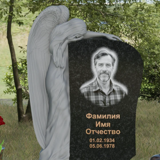 Центральным художественным элементом композиции является искусная скульптура скорбящего ангела, выполненная в технике глубокого барельефа. Фигура небесного защитника органично интегрирована в левую часть каменного полотна. Мы видим детальную проработку каждого перышка на опущенных крыльях, мягкие, ниспадающие складки плащаницы и кроткий изгиб шеи — ангел склонил голову в знак вечного сострадания. Особого внимания заслуживает игра фактур: матовая, бархатистая поверхность резной фигуры контрастирует с безупречным зеркальным блеском основной плоскости, на которой располагается портрет и эпитафия. Такая полировка создает эффект глубокого черного или цветного зеркала, в котором отражается небо, символизируя связь между земным и небесным.