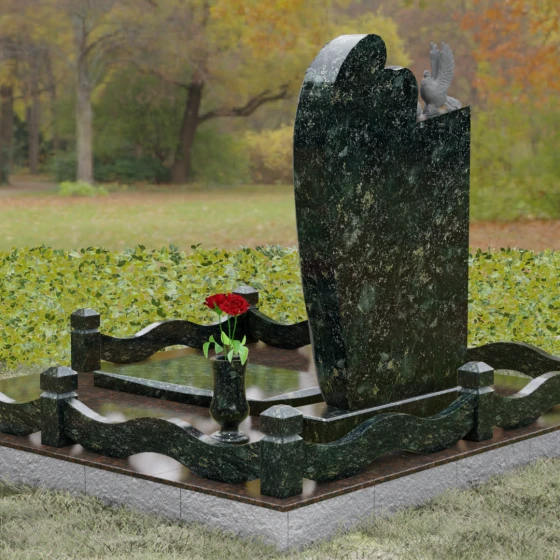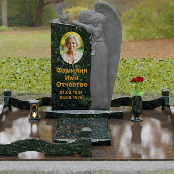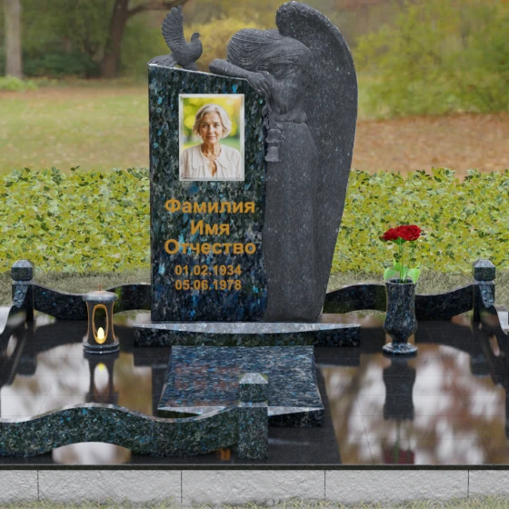 Верхний контур монумента украшен реалистичной фигуркой голубя, символизирующего чистоту души и мир. Композиция выстроена на игре фактур: идеально гладкий, иссиня-черный гранит отражает окружающий мир, в то время как резные элементы имеют благородную шероховатость, подчеркивающую природную суть материала. Форма стелы асимметрична, что придает всему комплексу динамику и современный вид в стиле модерн, сохраняя при этом торжественную монументальность.