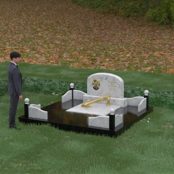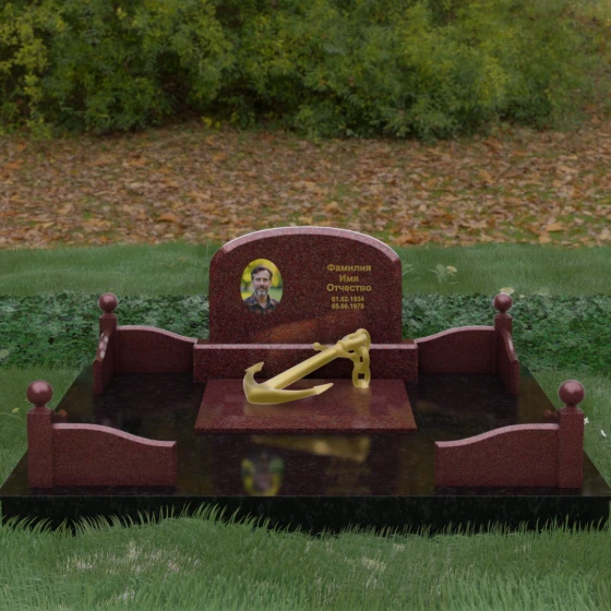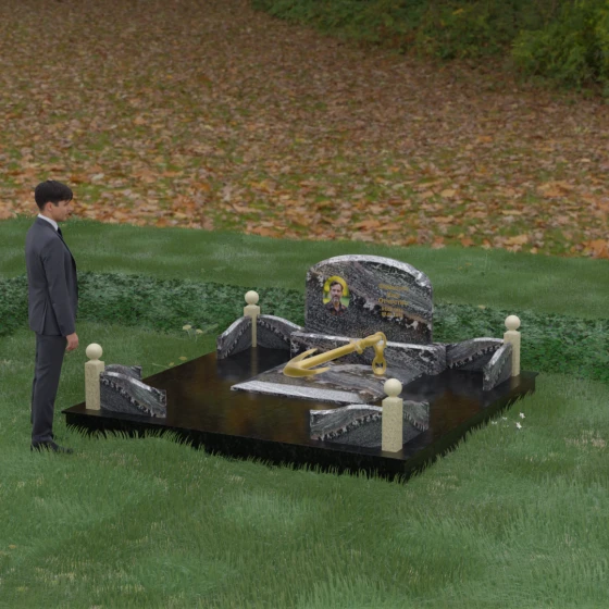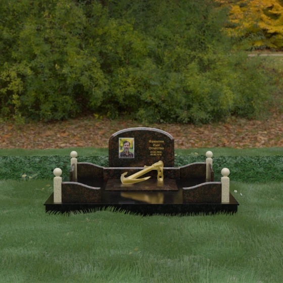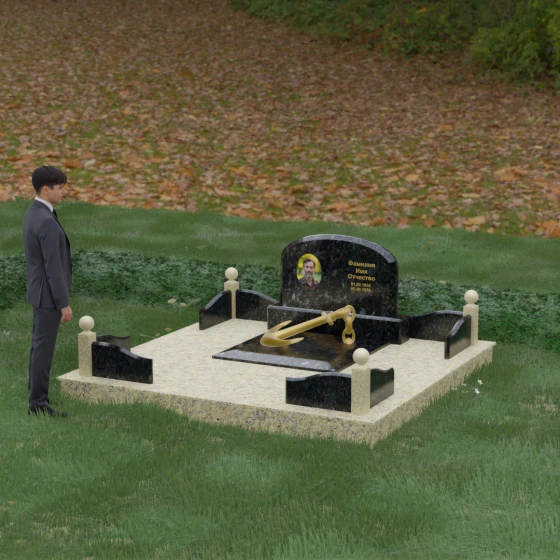• Центральный символ: На надгробной плите расположен объемный декоративный элемент в виде золотого якоря с массивной цепью. Этот символ олицетворяет надежду, твердость характера и профессиональный путь, связанный со стихией, становясь смысловым центром всего мемориала.