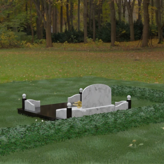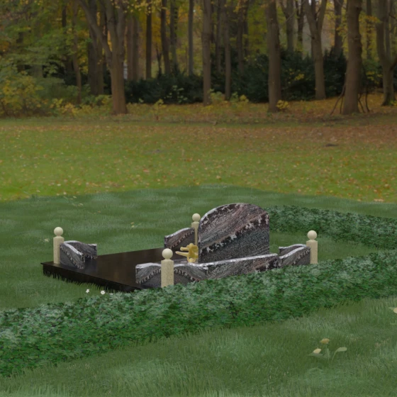 Представленная мемориальная композиция — это не просто дань уважения, а монументальное художественное произведение, воплощающее в камне идею незыблемости, надежности и вечного пристанища. В центре ансамбля расположена величественная вертикальная стела с мягким арочным завершением, чьи формы напоминают небесный свод. Геометрия изделия продумана до мелочей: строгие линии основания гармонично сочетаются с плавными изгибами боковых ограждений, создавая визуальный баланс между земной тяжестью камня и духовной легкостью формы. Особый акцент сделан на игре фактур — зеркальная, глубокая полировка лицевых поверхностей контрастирует с благородной матовостью резных элементов, подчеркивая природную красоту и глубину натуральной породы.