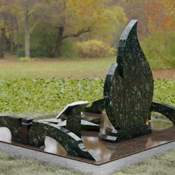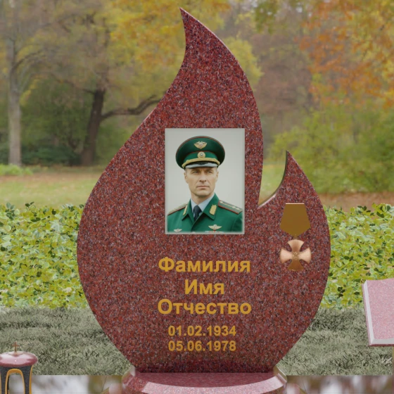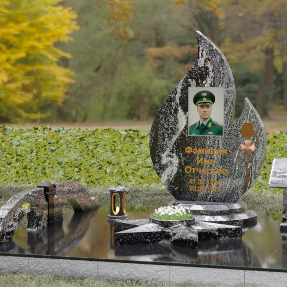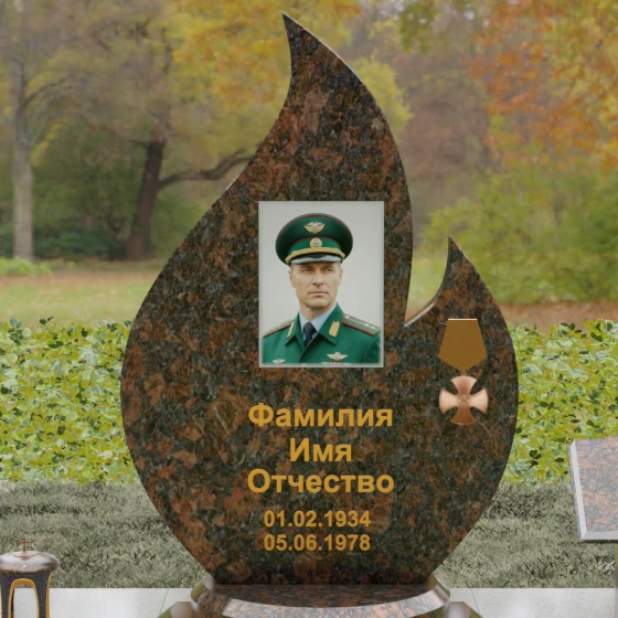 Центральное мемориальное изделие выполнено в уникальной форме застывшего пламени, которое стремится ввысь, символизируя неугасаемую энергию жизни. Плавные, текучие изгибы боковых граней переходят в изящное заостренное навершие, создавая динамичный и одновременно строгий силуэт. Особое внимание стоит уделить обработке камня: по всему периметру лицевой грани снята широкая фаска, которая благодаря безупречной зеркальной полировке создает великолепную игру света и тени, подчеркивая объем и скульптурность формы.