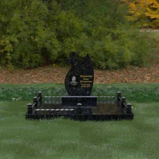 Особое значение в данной модели уделено благоустройству участка, которое превращает памятник в полноценный мемориальный комплекс. Участок полностью закрыт сплошным мощением из полированных плит, что создает ощущение чистоты, законченности и монументальности. По периметру установлен невысокий гранитный цоколь, выполняющий роль надежного фундамента и визуальной границы сакрального пространства. По углам и вдоль сторон расположены изящные каменные столбики из контрастного светлого гранита, соединенные витыми металлическими поручнями. Этот декоративный забор не изолирует мемориал, а придает ему аристократичную обособленность.