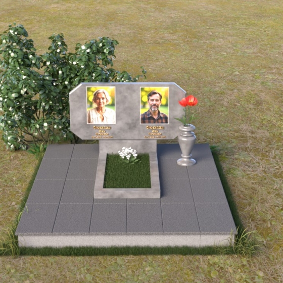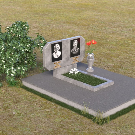 Композиция памятника строится на контрасте строгих геометрических форм и плавных линий, символизирующих жизненный путь и обретение покоя. Стела имеет форму, близкую к прямоугольнику, но с элегантно скошенными углами, смягчающими ее строгость. Верхняя часть стелы имеет две небольшие грани, словно фацеты драгоценного камня, добавляющие ей изысканности. Поверхность камня отполирована до зеркального блеска, что подчеркивает глубину черного цвета и создает ощущение торжественности. На лицевой стороне размещены портреты усопших, выполненные с высокой степенью детализации. Ниже портретов выгравированы надписи, выполненные строгим шрифтом. Справа от стелы установлена небольшая ваза, выполненная в том же стиле, что и памятник, и украшенная простым, но элегантным орнаментом.