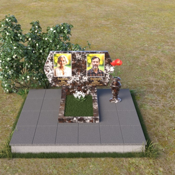 Величественная стела памятника ПГ004 представляет собой элегантное сочетание строгих линий и мягких, сглаженных углов. Верхняя часть имеет форму, близкую к прямоугольнику, но с деликатно скошенными верхними углами, что придает ей визуальную легкость и утонченность. Боковые грани плавно переходят в лицевую поверхность, создавая ощущение обтекаемости и завершенности. Фаска по периметру лицевой стороны подчеркивает четкость контура и добавляет дополнительный объем. Нижняя часть стелы, служащая основанием для размещения информации и портретов, выполнена в форме прямоугольной призмы, гармонично сочетающейся с основной частью памятника. Подставка под вазу выполнена в классическом стиле и имеет плавные обтекаемые формы.
