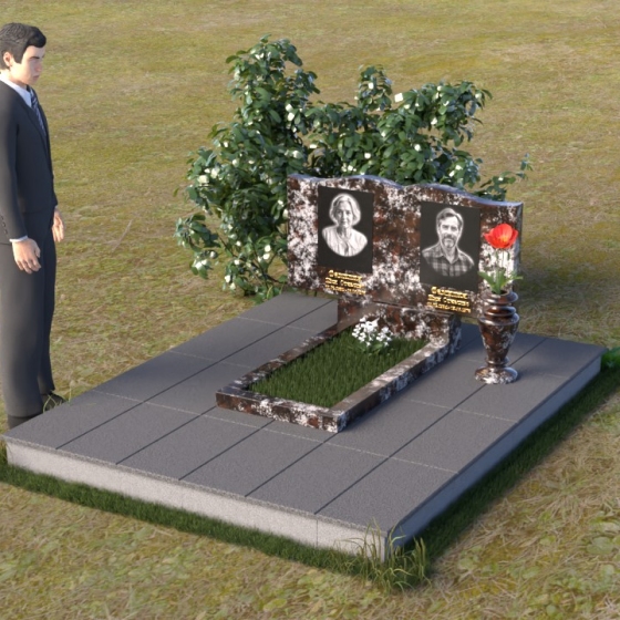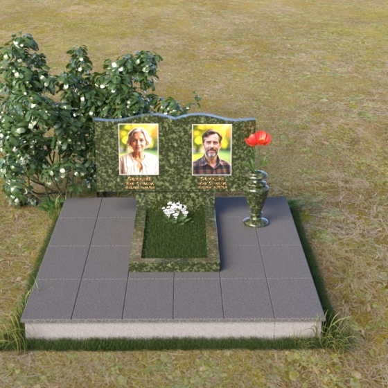 Этот гранитный монумент представляет собой вертикальную композицию, где основной акцент сделан на верхней части. Верхний край памятника имеет сложную, волнообразную форму, напоминающую плавные изгибы морской волны или нежные лепестки цветка. Этот элемент придает монументу легкость и изящество, смягчая строгость камня. Боковые грани монумента обработаны таким образом, чтобы подчеркнуть его вертикальность и стройность. Фаски по краям смягчают переход от лицевой поверхности к боковым, создавая ощущение завершенности и гармонии. Лицевая сторона монумента отполирована до зеркального блеска, отражая небо и окружающий мир, словно запечатлевая в себе вечность. На полированной поверхности выгравированы портреты усопших, выполненные с высокой степенью детализации. Под портретами расположены надписи с именами и датами жизни, выполненные строгим, элегантным шрифтом.