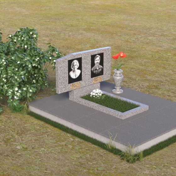 Основным элементом композиции является вертикальная плита, возвышающаяся над прямоугольным основанием. Гранитная плита имеет слегка вогнутую форму верхней грани, что придает ей мягкость и визуально облегчает массивность. На отполированной до зеркального блеска поверхности выгравированы портреты усопших, выполненные с высокой степенью детализации. Под портретами располагаются надписи с именами и датами жизни, выполненные строгим шрифтом. Вся композиция пронизана чувством сдержанности и достоинства, что позволяет сосредоточиться на главном – на памяти о тех, кого больше нет рядом.
