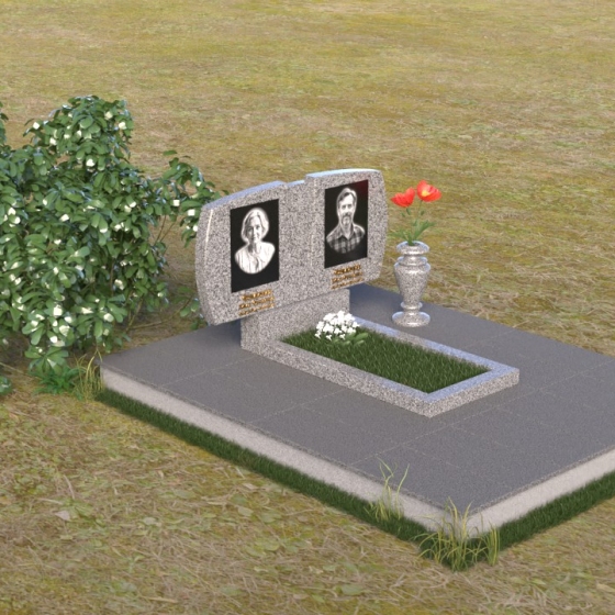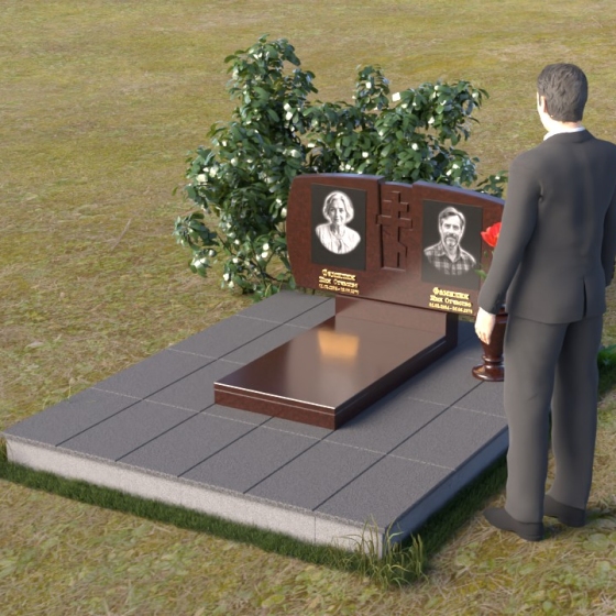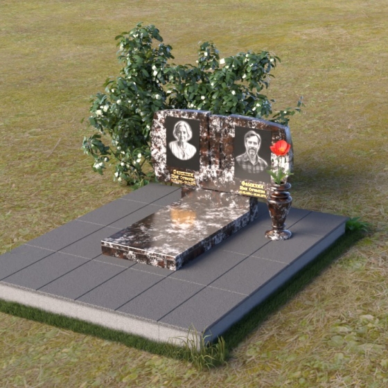 Геометрия модели тщательно продумана. Верхняя часть стел имеет скругленные углы, смягчающие строгость линий и придающие композиции более человечный облик. Между портретами выгравирован лаконичный православный крест, напоминающий о духовности и вере. Основание стел переходит в горизонтальную плиту, образуя единую плоскость с надгробной плитой. Надгробная плита выполнена в виде прямоугольника с полированной поверхностью, отражающей небо и окружающий мир. У основания композиции располагается аккуратная ваза из черного гранита, предназначенная для живых цветов, как символ непреходящей любви и уважения.