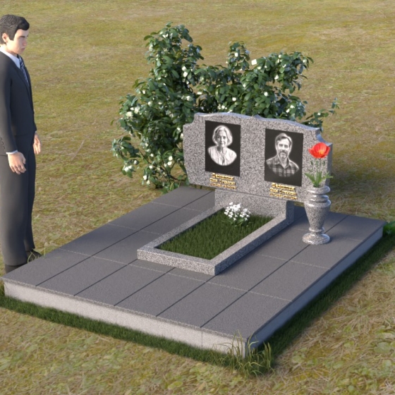 Композиция монумента строится на контрасте плавных линий и строгих геометрических форм. Верхняя часть, несущая на себе портреты усопших, имеет форму, напоминающую раскрытую книгу или свиток, где каждая страница хранит историю жизни. Края этого "свитка" искусно обработаны: верхняя грань словно оплавлена временем, приобретая мягкие, неровные очертания, а боковые стороны имеют более четкий, но все же сглаженный профиль. Фаска, идущая по периметру, придает верхней части визуальную легкость, отделяя ее от основания. Нижняя часть представляет собой прямоугольную плиту с зеркальной полировкой, отражающей небо и окружающий мир, создавая эффект бесконечности и связи с ушедшим. Она словно портал, соединяющий мир живых и мир мертвых, напоминая о непрерывности бытия. Боковины плиты имеют четкую геометрию, подчеркивая основательность и незыблемость памяти.
