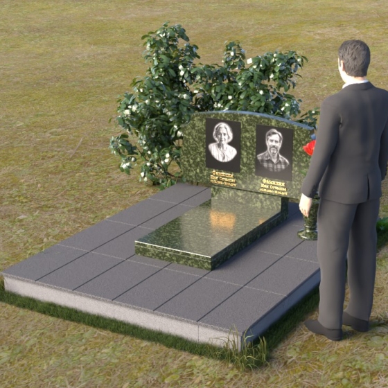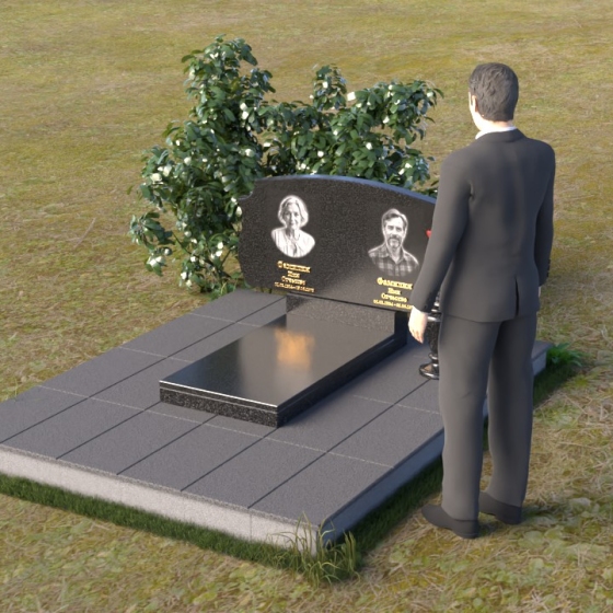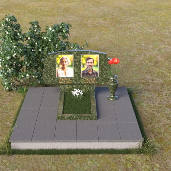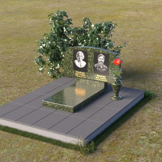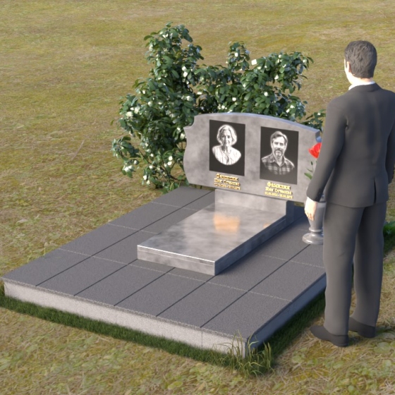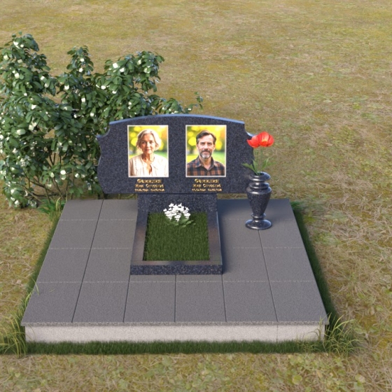 Этот памятник представляет собой вертикальную стелу, выполненную из полированного гранита. Форма стелы – это сочетание строгих прямых линий и плавных, скругленных изгибов. Верхняя часть памятника имеет волнообразный силуэт, создающий ощущение мягкости и умиротворения. Боковые грани стелы слегка скошены, что придает ей визуальную легкость и изящество. Лицевая поверхность тщательно отполирована до зеркального блеска, отражая свет и создавая эффект глубины. На полированной поверхности выгравированы портреты усопших, их имена, даты жизни, выполненные строгим шрифтом. Под портретами расположены небольшие прямоугольные ниши, которые могут быть использованы для размещения лампад или цветов. Нижняя часть памятника представляет собой горизонтальную плиту, также выполненную из полированного гранита. Плита служит основанием для стелы и обеспечивает ее устойчивость. Фаски по краям плиты смягчают ее строгую геометрию.