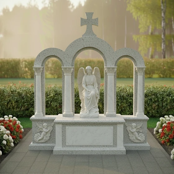 Кому подойдет: Эта мемориальная композиция идеально подойдет для тех, кто ищет не просто надгробный знак, а настоящее произведение мемориального искусства, способное выразить глубокую скорбь и вечную любовь. Она станет достойным воплощением памяти о человеке, чья жизнь была наполнена светом, верой и достоинством. Величественная аркада, символизирующая переход в иной мир, и фигура ангела, олицетворяющая чистоту души, делают эту композицию идеальным выбором для увековечения памяти о близком человеке, чья жизнь оставила неизгладимый след. Мемориальная композиция ПН 044 доступна для заказа в 8 цветовых решениях, что позволяет подобрать материал, наиболее точно отражающий характер и индивидуальность усопшего. Вы можете выбрать один из семи видов гранита: гранит Амфиболит с его глубоким черным цветом, величественный Балтик Грин, благородный Блю Перл, классический Габбро-диабаз, теплый Дымовский, изысканный Лезниковский или светлый Мансуровский. Также доступен мрамор Тассо, который придаст композиции особую нежность и утонченность. Такой широкий выбор материалов дает возможность создать по-настоящему уникальный и персонализированный мемориал, созвучный духу и памяти усопшего.