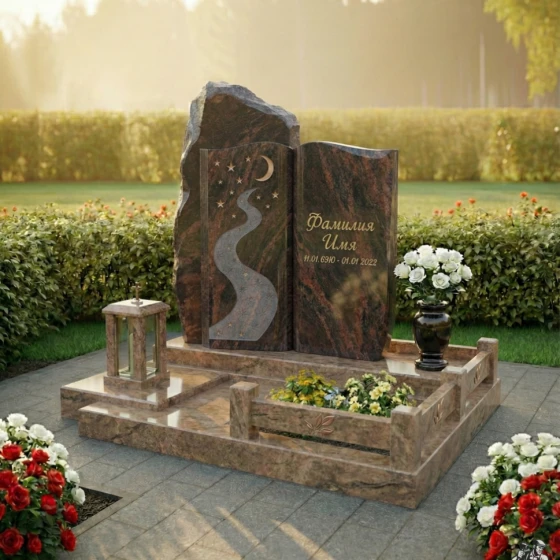 Модель ПН 196 представляет собой двухчастную композицию, где каждая стела обладает своим неповторимым характером. Левая стела, выполненная в виде необработанной скалы, символизирует вечность и незыблемость. Её фактурная поверхность, лишенная зеркальной полировки, создает ощущение первозданной мощи природы. На этой стеле, словно высеченная самой природой, изображена гравировка, стилизованная под ночное небо с извивающейся рекой звезд. Полумесяц и россыпь мерцающих звезд, выполненные с удивительной детализацией, создают эффект глубины и космического спокойствия, а светлая матовая фактура рисунка контрастирует с темным, почти черным полированным фоном, придавая изображению объем и выразительность. Звездная река, плавно уходящая вверх, символизирует путь души к небесам, а звезды напоминают о ярких моментах жизни.