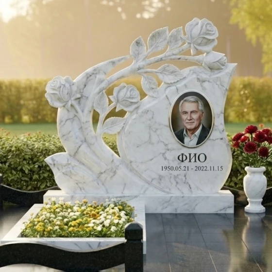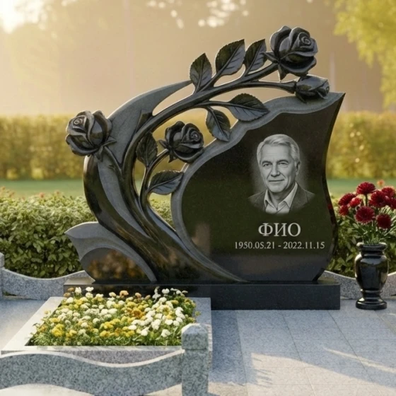 Мемориальная композиция Артикул: ПН 431 представляет собой подлинное произведение искусства, воплощенное в камне. Ее эстетика пронизана глубоким символизмом и изысканной детализацией, призванной увековечить светлую память о человеке. Центральным элементом композиции является стела необычной, динамичной формы, напоминающей развевающееся знамя или раскрывающийся бутон. Ее плавные, изогнутые линии создают ощущение легкости и движения, несмотря на массивность материала. Верхняя часть стелы элегантно изгибается вправо, а левая сторона украшена объемной резьбой в виде ветви розы с распустившимися бутонами. Каждая роза выполнена с поразительной детализацией: лепестки мастерски вырезаны, создавая ощущение их нежности и природной красоты, а бутоны словно вот-вот раскроются, символизируя вечную жизнь и непреходящую любовь. Резные элементы, выполненные в глубоком черном граните, контрастируют с безупречно отполированной основной поверхностью стелы, создавая игру света и тени, подчеркивающую объем и утонченность работы. Этот контраст между зеркальным блеском и матовой глубиной резьбы придает композиции особую выразительность и благородство.