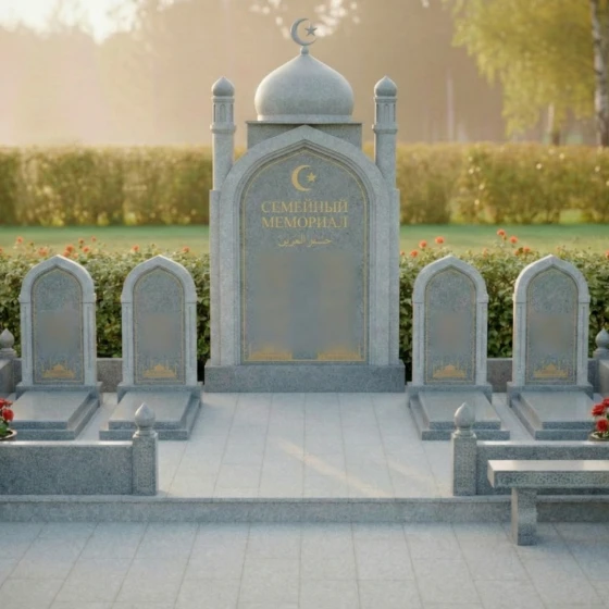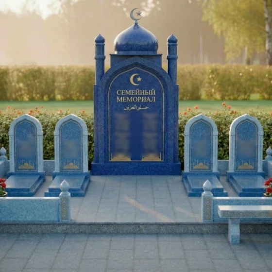 Оформление: Для центральной арки я рекомендую использовать сусальное золото при нанесении фамилии рода и каллиграфии — это подчеркнет статусность объекта. Для индивидуальных стел идеально подойдет лазерная гравировка портретов высокой четкости: на темном полированном камне лица будут выглядеть живыми, сохраняя теплоту взгляда на десятилетия. Если вы предпочитаете аскетичность, можно ограничиться только золоченым арабским орнаментом и текстами из священных книг.