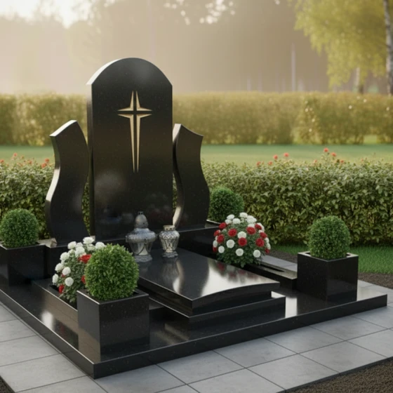 • Комплектация: Основная стела, боковые декоративные элементы, многоуровневая надгробная плита, массивный цоколь.