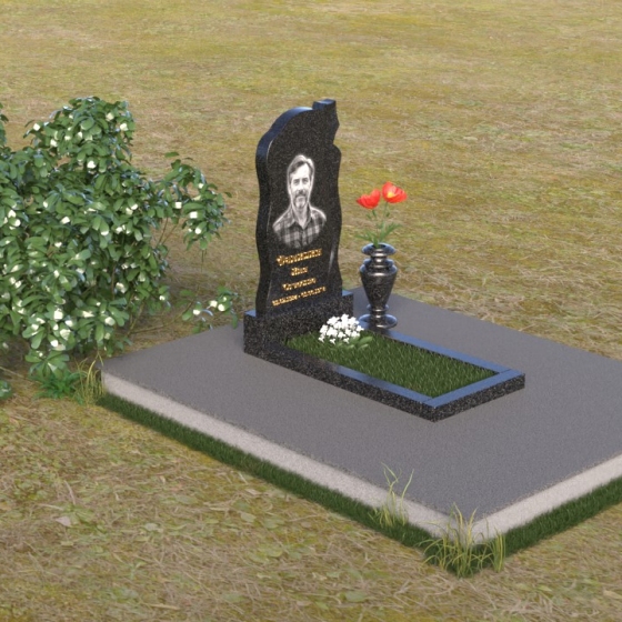 Памятник ПВ 043 – это воплощение сдержанной элегантности и монументальной прочности. Величественная стела, словно застывшая капля, устремлена ввысь, символизируя духовное вознесение. Верхняя часть памятника имеет ассиметричный, но при этом гармоничный контур, создавая ощущение легкости и динамики, несмотря на массивность камня. Скошенные края, выполненные с филигранной точностью, добавляют скульптурности и выразительности. Золотое тиснение имени и дат контрастирует с глубоким черным цветом полированного гранита, акцентируя внимание на личности ушедшего.