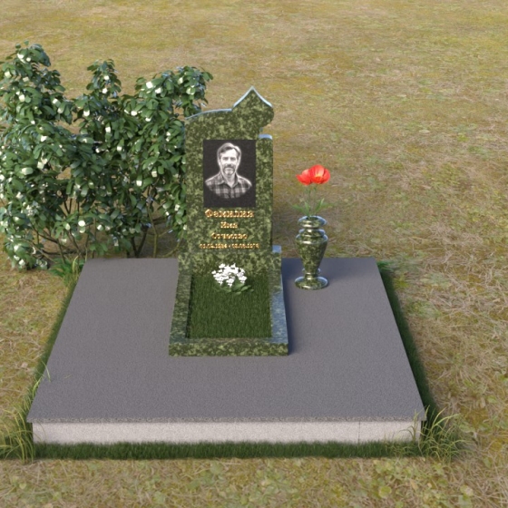 Этот мемориальный комплекс, включающий в себя величественную стелу, сочетает в себе строгость линий и глубину символизма, создавая достойный образ памяти. Взгляд сразу приковывает форма стелы – она будто сложена из двух частей: основная, устремленная вверх, и верхняя, с вырезанными элементами, напоминающими очертания пламени свечи или крыльев ангела. Обработка граней выполнена с особой тщательностью, создавая игру света и тени, подчеркивая благородство камня. Зеркальная полировка основной части стелы отражает окружающий мир, словно запечатлевая в себе моменты жизни, а матовая поверхность выгравированного портрета и надписи создает тактильный контраст, приглашая прикоснуться к истории.
