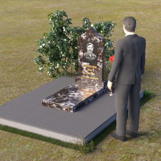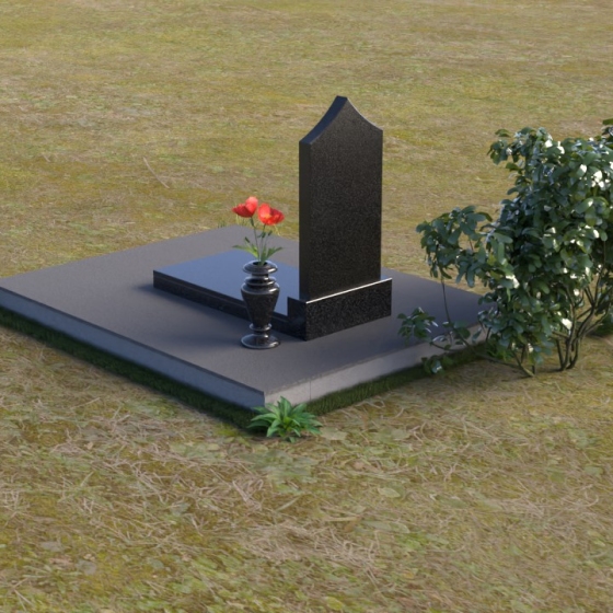 Начиная с основания, мы видим строгую прямоугольную форму, символизирующую незыблемость и надежность. Горизонтальная плита, установленная на небольшом возвышении, служит своеобразным пьедесталом для основного элемента композиции. Её зеркальная поверхность отражает небо и окружающий мир, создавая ощущение легкости и воздушности. Вертикальный элемент имеет форму, напоминающую арку с заостренным верхом, что придает ему устремленность ввысь, символизируя духовное восхождение. Верхняя часть обработана таким образом, чтобы создать небольшую площадку. На самом камне выгравирован портрет усопшего и памятная надпись, выполненная элегантным шрифтом.