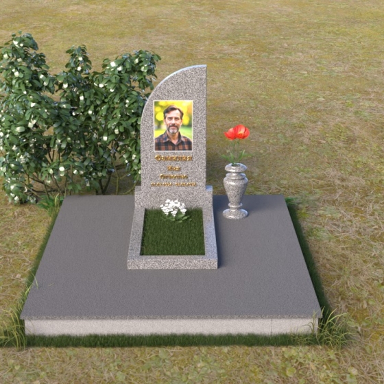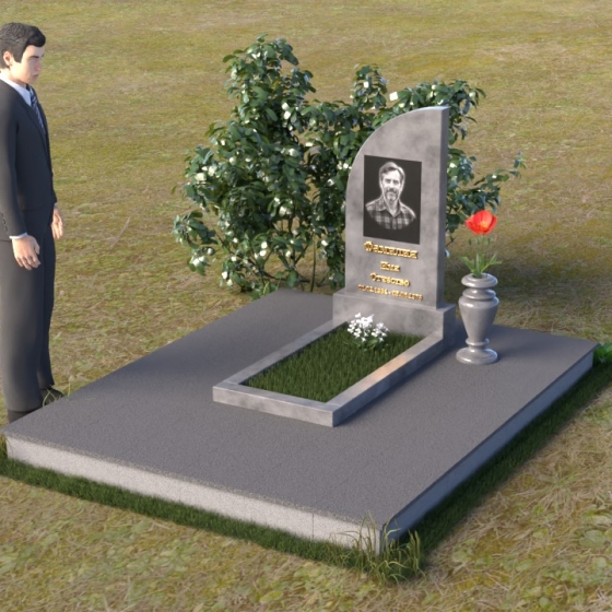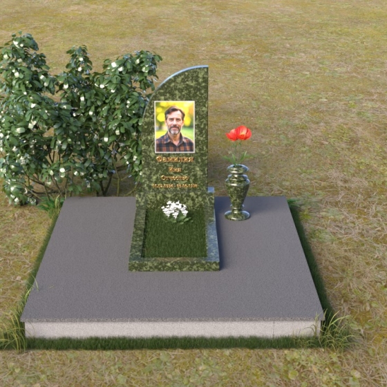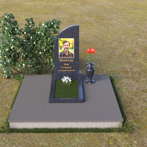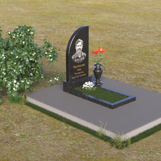 Стела имеет форму, близкую к прямоугольнику, но ее верхняя часть оформлена в виде плавной, скругленной волны. Этот изгиб смягчает строгость линий, привнося в образ нотки умиротворения и надежды. На полированной поверхности стелы выгравирован портрет, имя и даты жизни. Золотистые буквы словно светятся на фоне черного камня, привлекая внимание к важным деталям. Рядом со стелой располагается небольшая ваза из черного гранита, предназначенная для живых цветов, символизирующих вечную память и любовь. Лаконичная форма вазы не отвлекает внимание от основного образа, а лишь дополняет его.