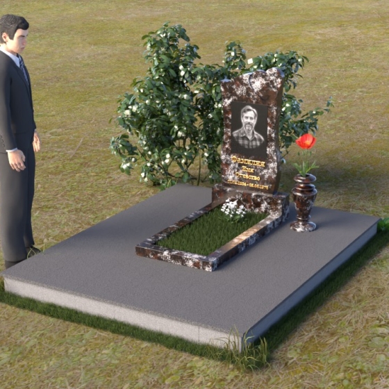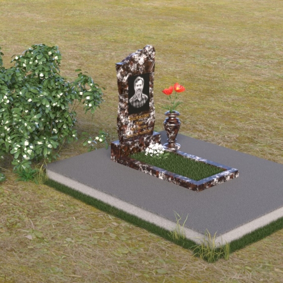 Дополнительным элементом композиции служит горизонтальная плита, выполненная из того же материала, что и стела. Она создает ощущение устойчивости и надежности, подчеркивая монументальность сооружения. На эту плиту можно возложить цветы или установить лампадку, чтобы почтить память усопшего. Рядом со стелой установлена небольшая ваза из черного гранита, предназначенная для живых цветов. Ее классическая форма и строгие линии гармонично дополняют общий стиль памятника.