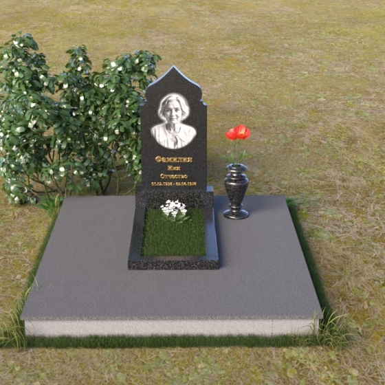 Величественная стела ПВ 059 представляет собой лаконичную, но выразительную композицию. Основной элемент – вертикальная плита из черного гранита, с зеркальной полировкой. Верхняя часть стелы имеет сложную форму, напоминающую мягкий, скругленный свод, с небольшим углублением в центре, что придает ей визуальную легкость и устремленность ввысь. Боковые грани стелы плавно скруглены, лишены острых углов, что создает ощущение мягкости и спокойствия. На лицевой стороне стелы размещен портрет усопшего, выполненный с высокой детализацией. Ниже портрета выгравированы имя и даты жизни, выполненные элегантным шрифтом.