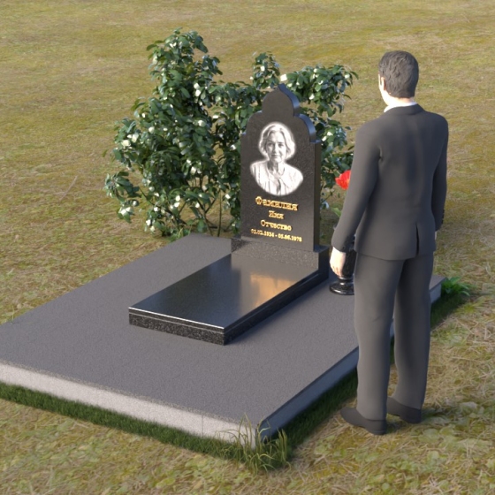 Основание композиции – прямоугольная плита с ровной, матовой поверхностью, обеспечивающая надежную устойчивость всей конструкции. На ней располагается горизонтальная плита, выполненная в виде усеченного параллелепипеда с зеркально отполированной поверхностью. Эта плита создает эффект глубины и отражает окружающий мир, словно запечатлевая моменты жизни ушедшего. Вертикальная стела возвышается над горизонтальной плитой, ее верхняя часть выполнена в форме изящной арки с плавными изгибами. Арка завершается небольшим декоративным элементом, напоминающим купол, что придает памятнику особую выразительность и духовность.