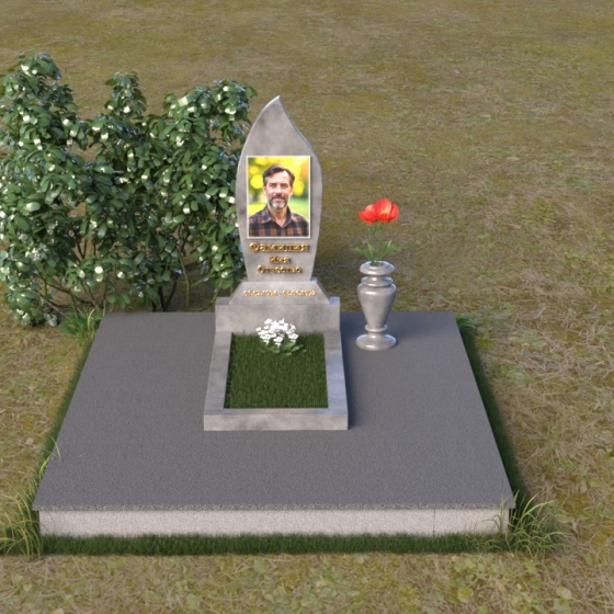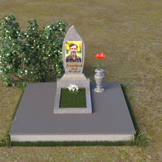 В верхней части стелы располагается гравировка с портретом усопшего, выполненная с высокой точностью и вниманием к деталям. Ниже выгравировано имя и отчество, а также даты жизни, обрамленные строгой рамкой. Под портретом, словно нежный акцент, расположена небольшая гранитная полочка, предназначенная для цветов или свечей, символизирующих неугасающую память.