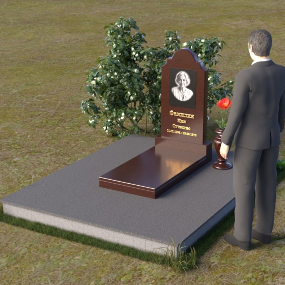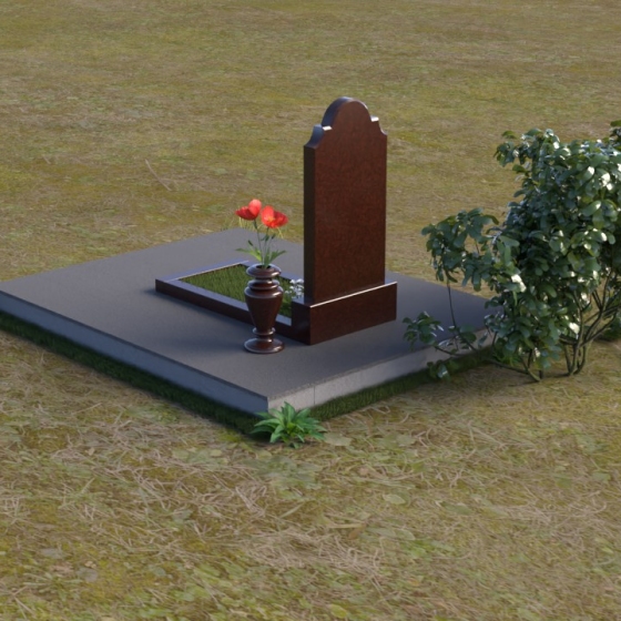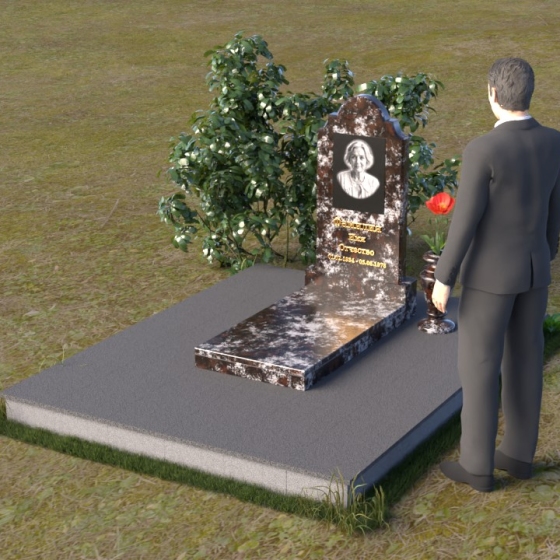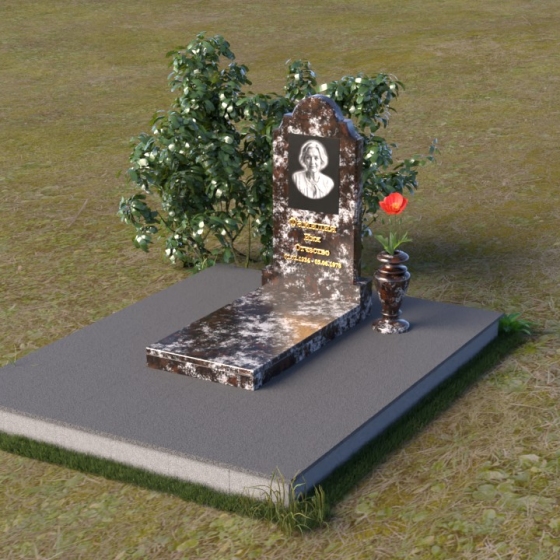 Мемориальная композиция ПВ 067 представляет собой вертикальную стелу, увенчанную плавной, изящной аркой. Верхняя часть стелы имеет аккуратно скругленные углы, что придает ей мягкость и утонченность. В верхней части стелы располагается овальный медальон с портретом. Нижняя часть стелы переходит в горизонтальную плиту, образуя единое целое. Плита имеет строгую прямоугольную форму с четкими гранями. Фаска по периметру плиты придает ей законченный вид и подчеркивает геометрию. Рядом со стелой установлена небольшая ваза из того же материала, выполненная в классическом стиле. Ее плавные линии и темный цвет гармонично сочетаются с основным элементом композиции.