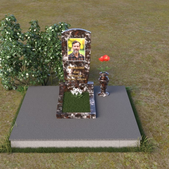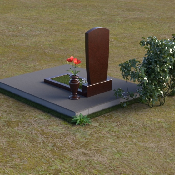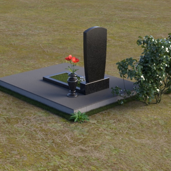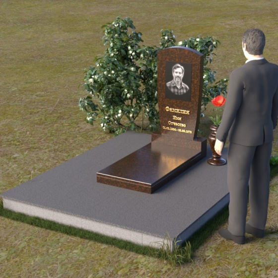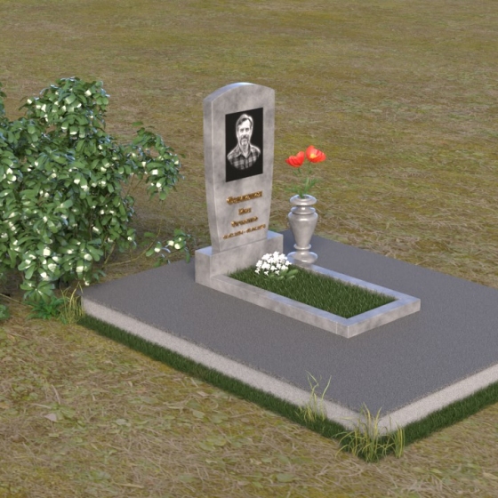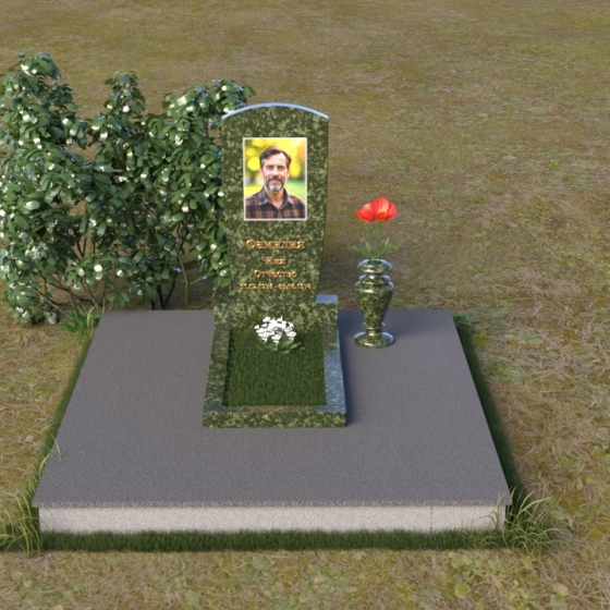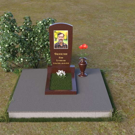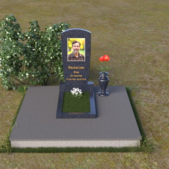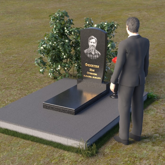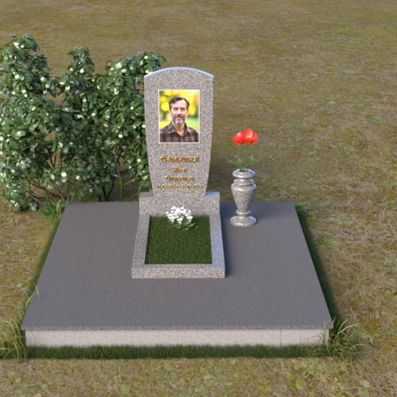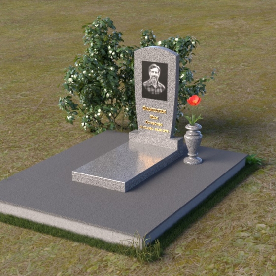 Вертикальная ориентация надгробного сооружения идеально подходит для размещения портрета усопшего, который словно смотрит на нас из вечности. Золотое тиснение имени и дат жизни, выполненное с особым вниманием к деталям, придает памятнику торжественность и значимость. Гладкая поверхность нижней части позволяет разместить эпитафию, слова скорби и любви, которые будут согревать сердца близких. Небольшая тумба, расположенная у основания, служит надежной опорой для основного элемента и создает ощущение завершенности композиции. Рядом с памятником можно установить вазу для цветов, которая станет символом живой памяти и любви. Красная роза в вазе – это яркий акцент, символ вечной любви и неувядающей красоты.