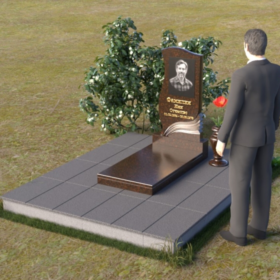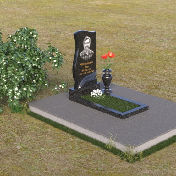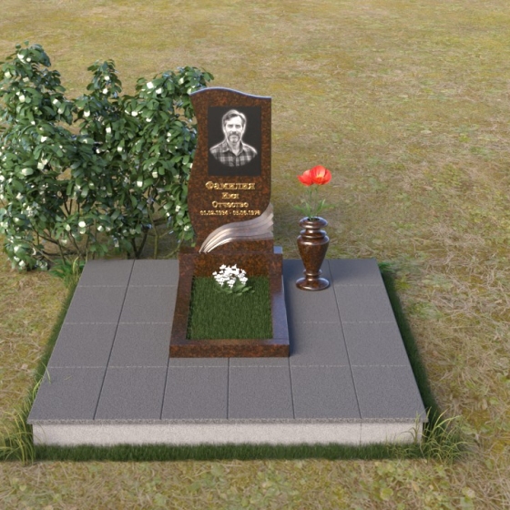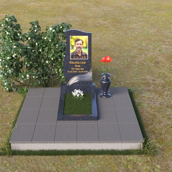 Надгробие из натурального камня ПВ 111 представляет собой элегантную композицию, где плавные линии и строгие формы гармонично сочетаются. Стела имеет форму, напоминающую раскрытую книгу, страницы которой плавно переходят одна в другую, создавая ощущение легкости и устремленности ввысь. Верхняя часть стелы, обрамляющая портрет, имеет скругленные углы и мягкий, волнообразный абрис, словно нежные объятия. Боковые грани стелы искусно обработаны, создавая игру света и тени, подчеркивающую благородство материала. В нижней части памятника расположен декоративный элемент в виде волны, выполненный в светлом тоне, что создает контраст с полированной поверхностью стелы и добавляет композиции динамики. Подставка под стелу выполнена в виде прямоугольной плиты с полированными фасками, что придает ей законченный и элегантный вид.